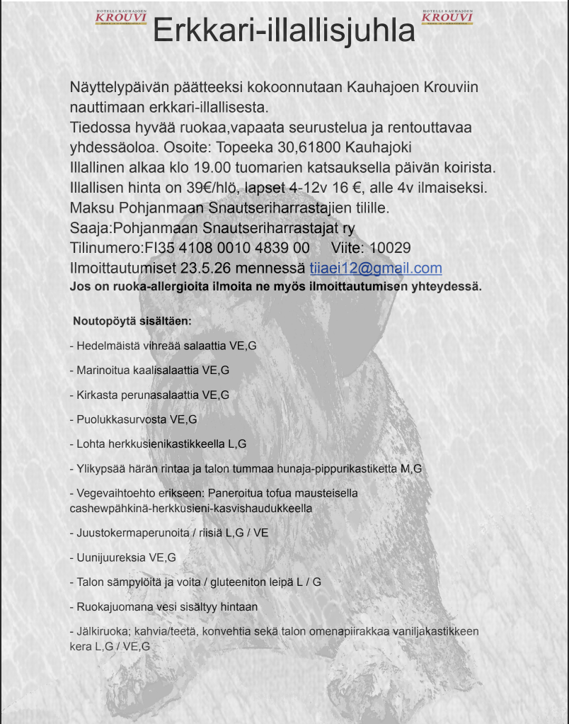 Snautserien erikoisnäyttely järjestetään tänä vuonna lauantaina 13.6.2026 Kauhajoen urheilukeskuksessa, osoitteessa Kenttätie 15.