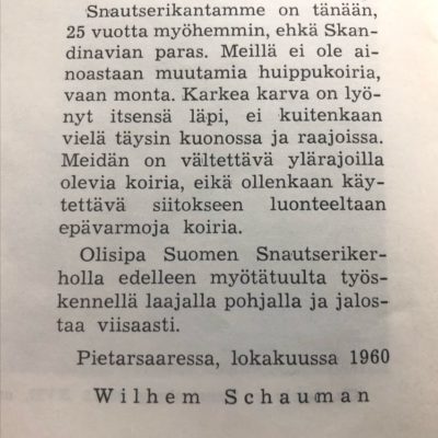 Ensimmäiset snautserit tuotiin Suomeen 1930 -luvulla. Koskaan snautseri ei ole ollut kotimaassaan sen enempää kuin meillä Pohjolassakaan muotikoira, mutta aina sillä on ollut omat uskolliset ihailijansa.